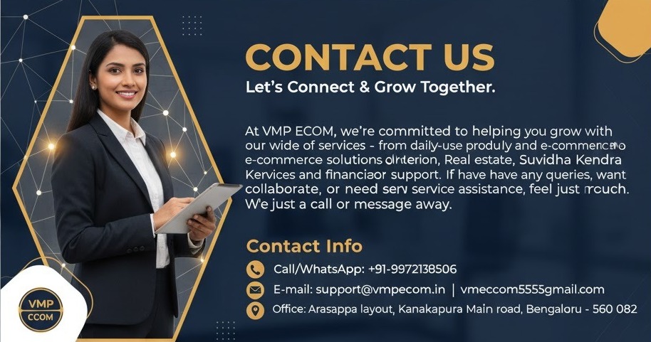 At VMP ECOM We're comitted to helping you grow with our wide range of services - from daily-use product supply and emmorce solutions to Interior design, Real estate, Suvidha Kendra services and financial products adivisor support. If you have any queries, want to collaborate, or need service assistance, feel free to reach out. We just a call or Message away.
